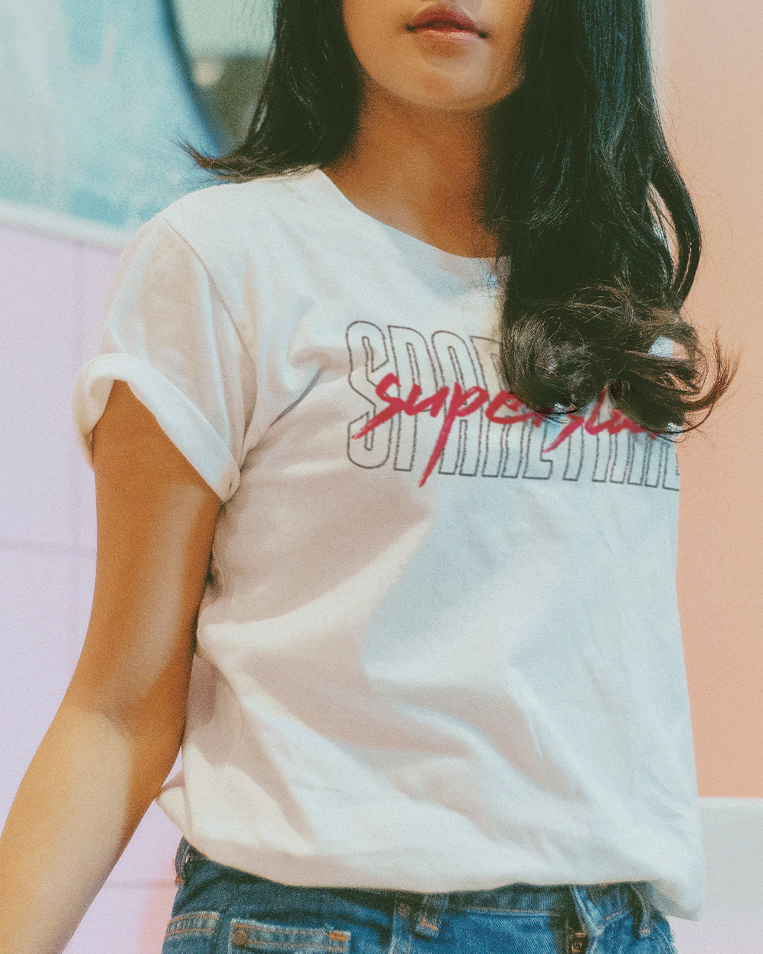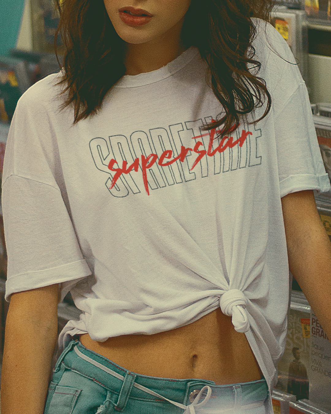 Sparetime Superstar “Red Script” logo on a White shirt
